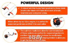 READY TO USE - It's certainly hassle-free as you get all you need in the box including tool Kit, harness & fuel mixing bottle. 1 x 52cc, 1.6 HP engine. 1 x Ready-filled bump feed two line spool.